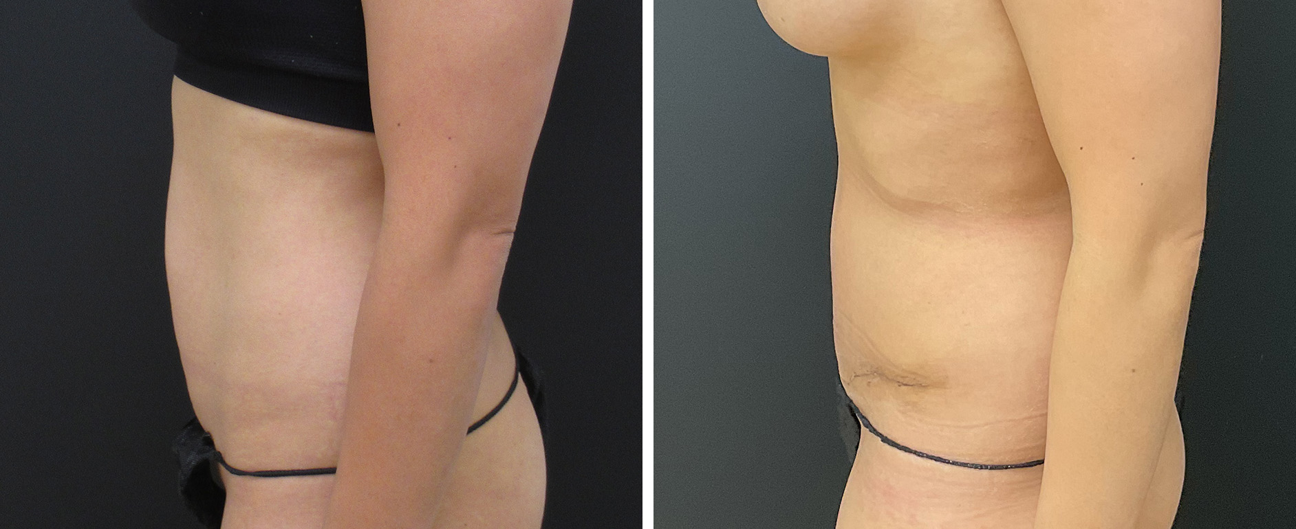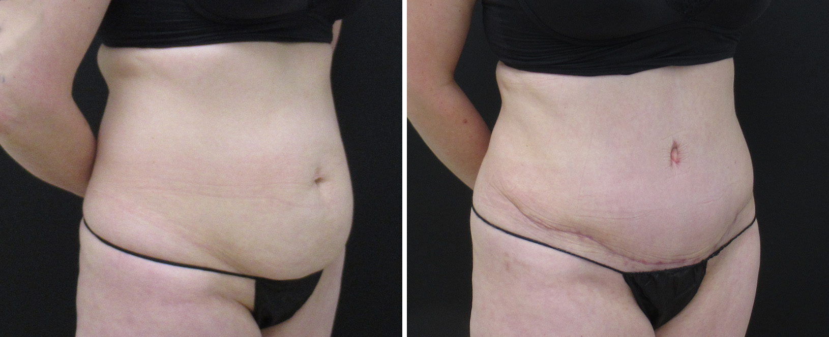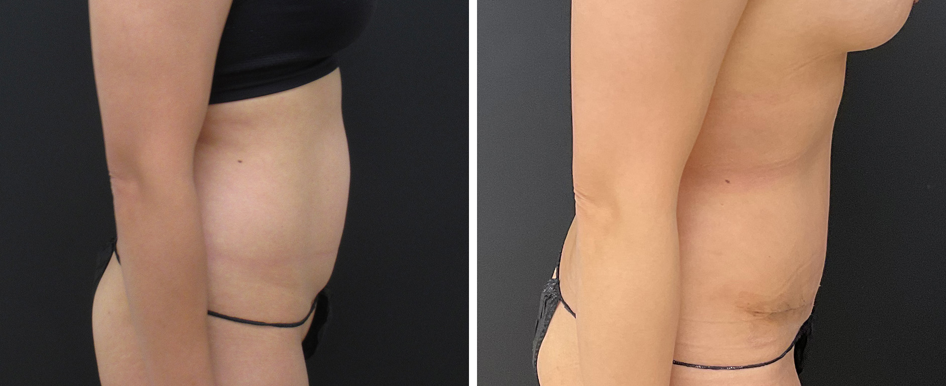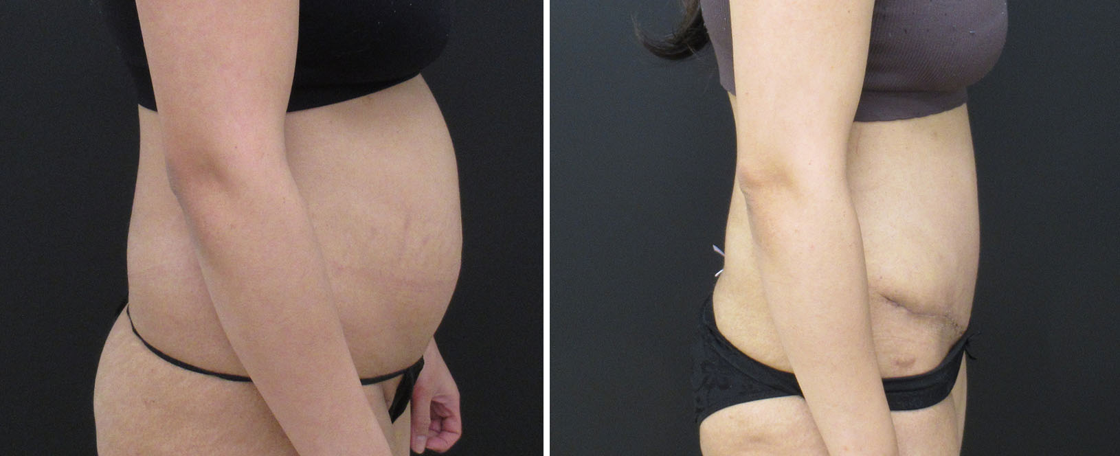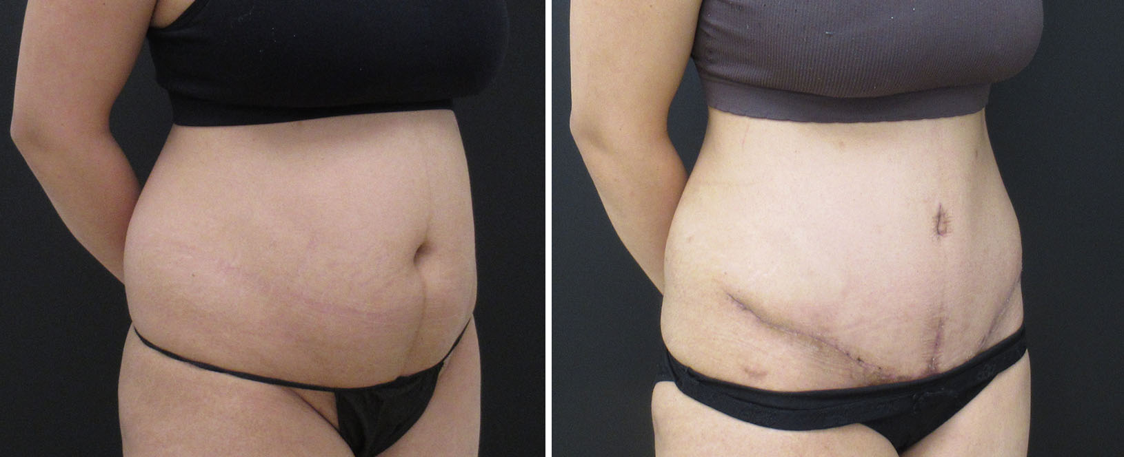 This 35-year-old (5’0”, 110lbs) mother of two had previously undergone liposuction to the anterior abdomen, resulting in some lumpiness and unsatisfactory skin tightening. She underwent provision liposuction, and an abdominoplasty, no muscle tightening was required. Her postoperative photographs are taken three months after surgery.