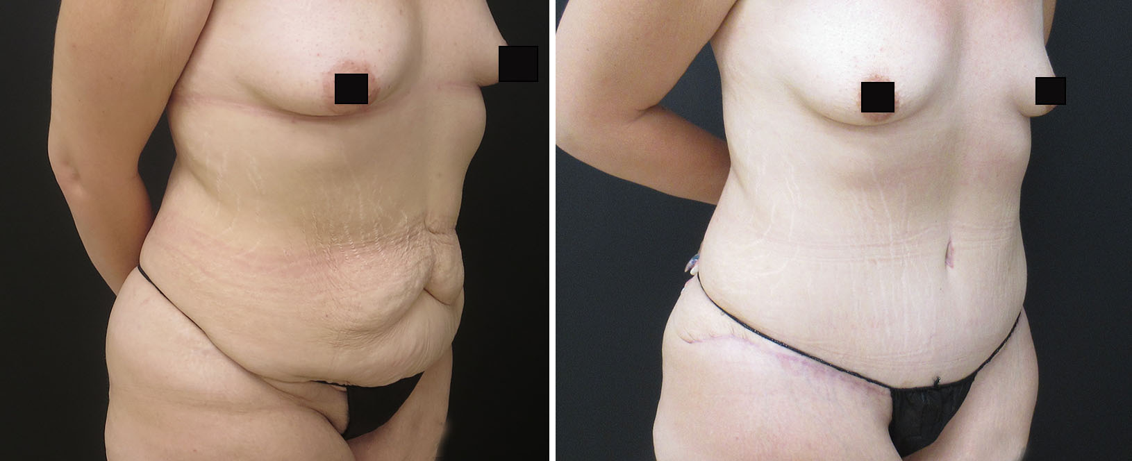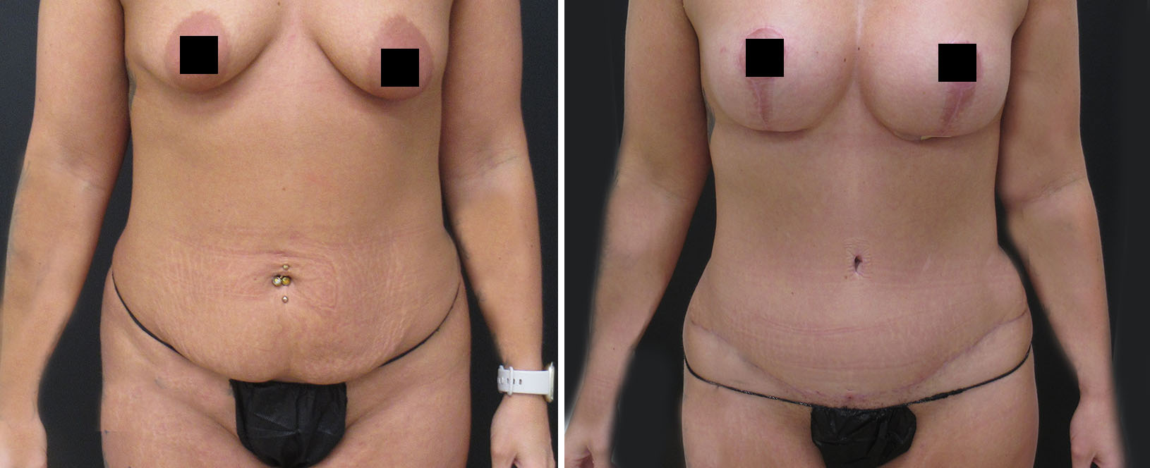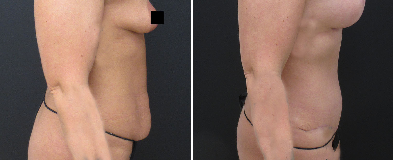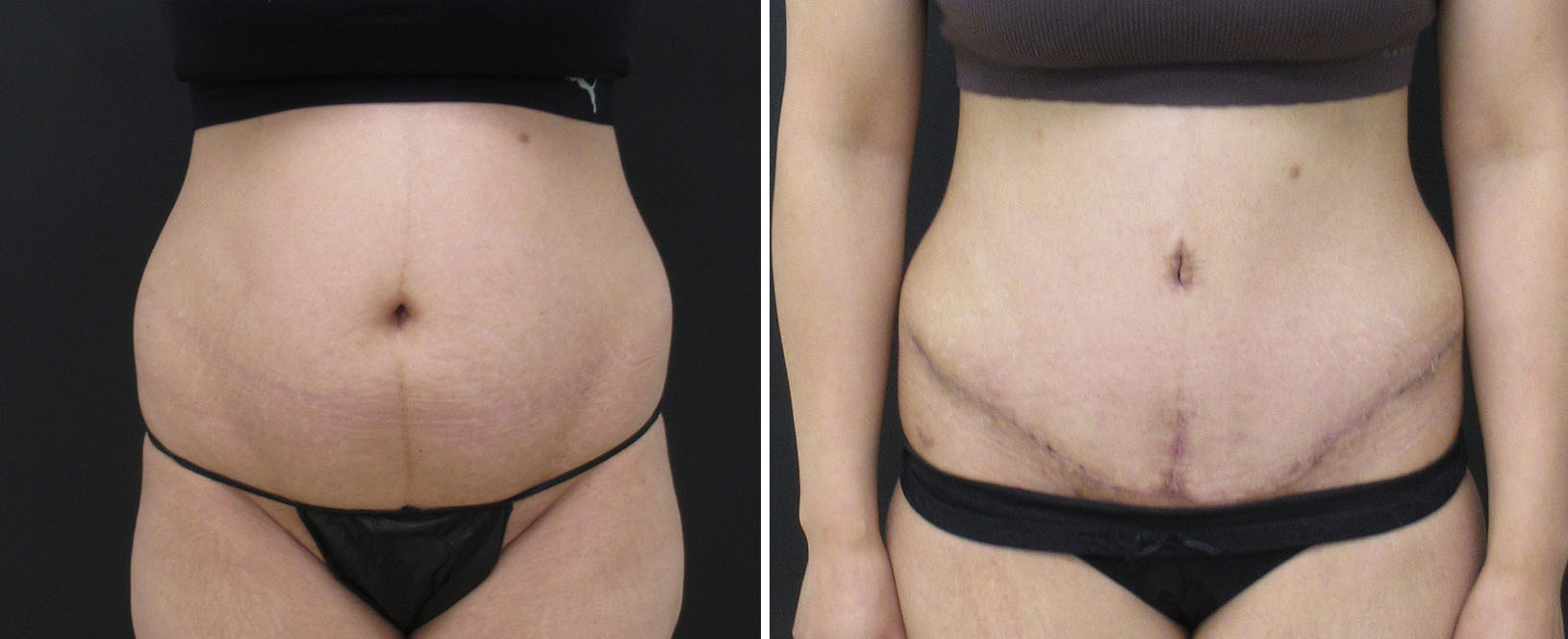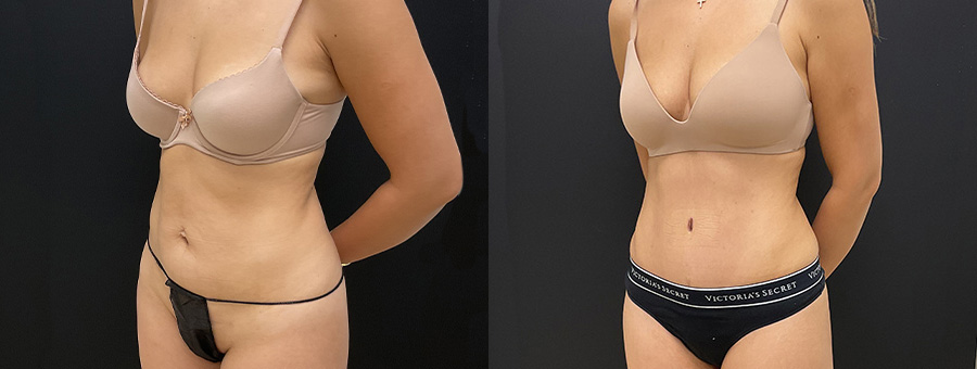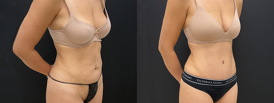 This 35-year-old (5’0”, 110lbs) mother of two had previously undergone liposuction to the anterior abdomen, resulting in some lumpiness and unsatisfactory skin tightening. She underwent provision liposuction, and an abdominoplasty, no muscle tightening was required. Her postoperative photographs are taken three months after surgery.