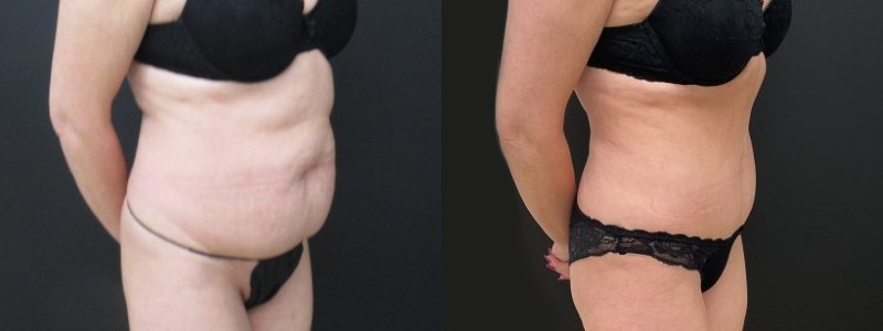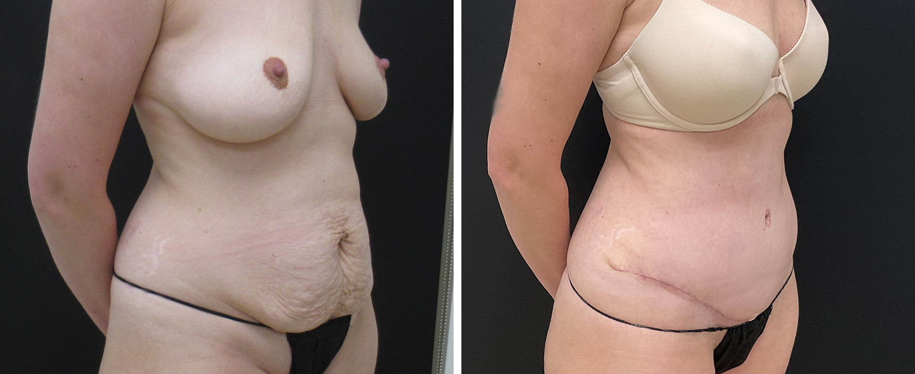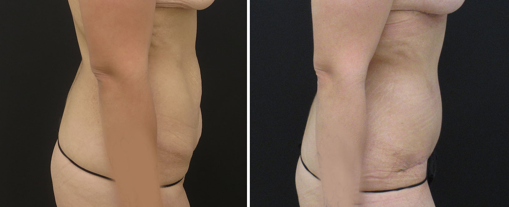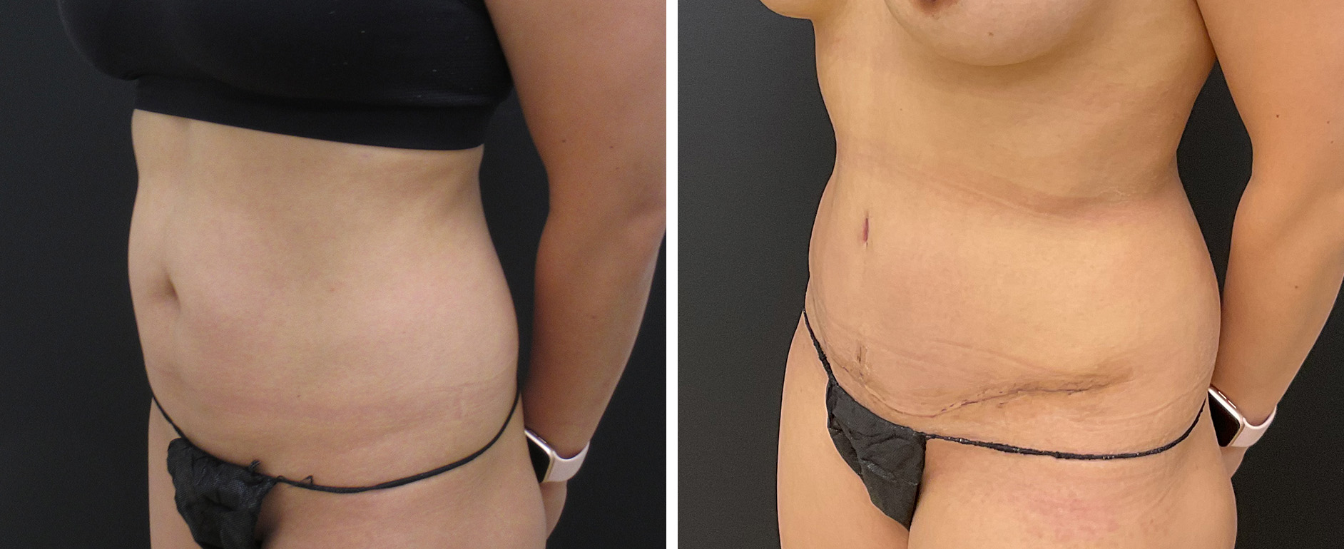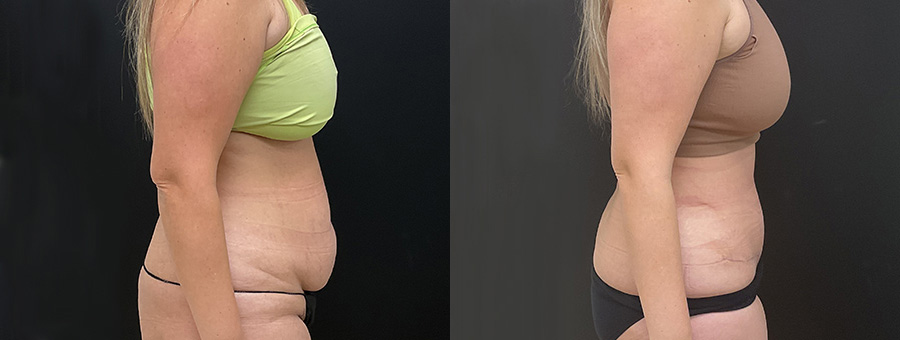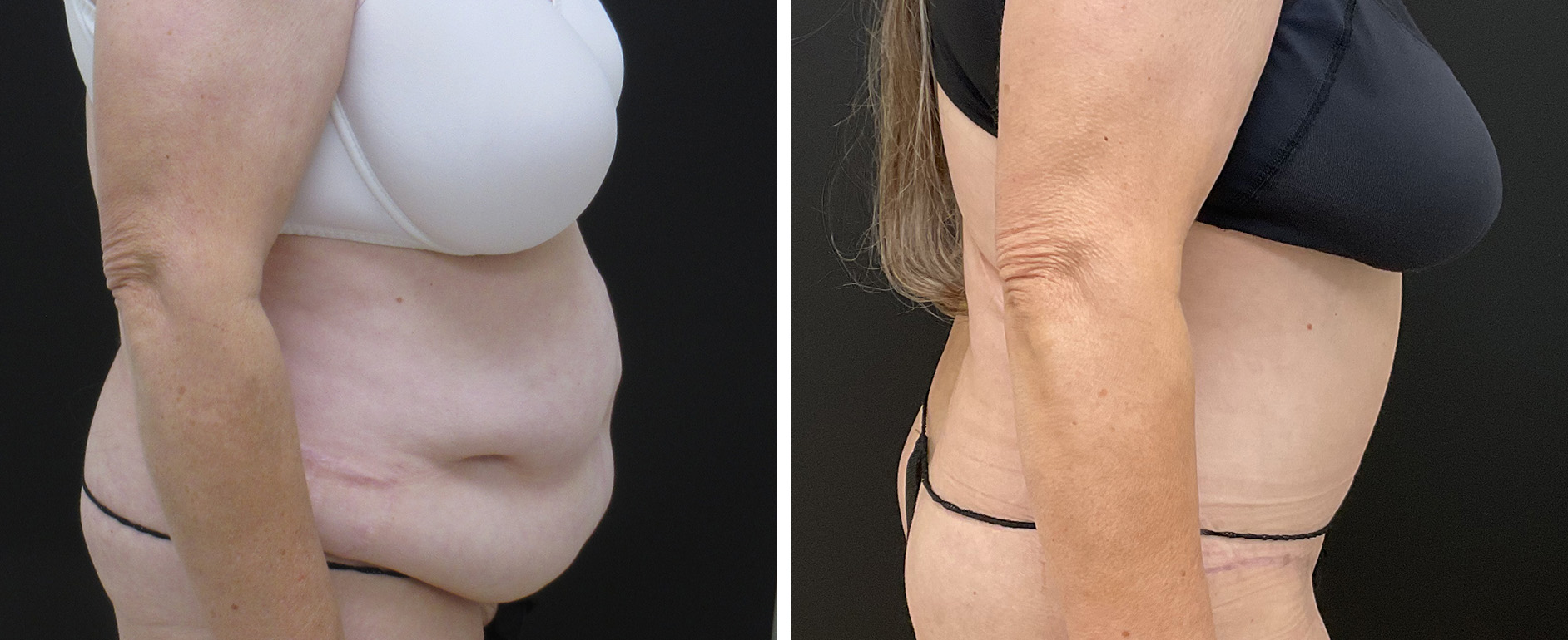 Our patient came to see Dr Roller unhappy with her stomach. Dr Roller performed an abdominoplasty (tummy-tuck) with muscle-tightening and liposuction to flanks and abdomen.