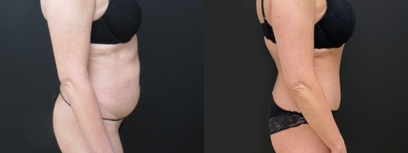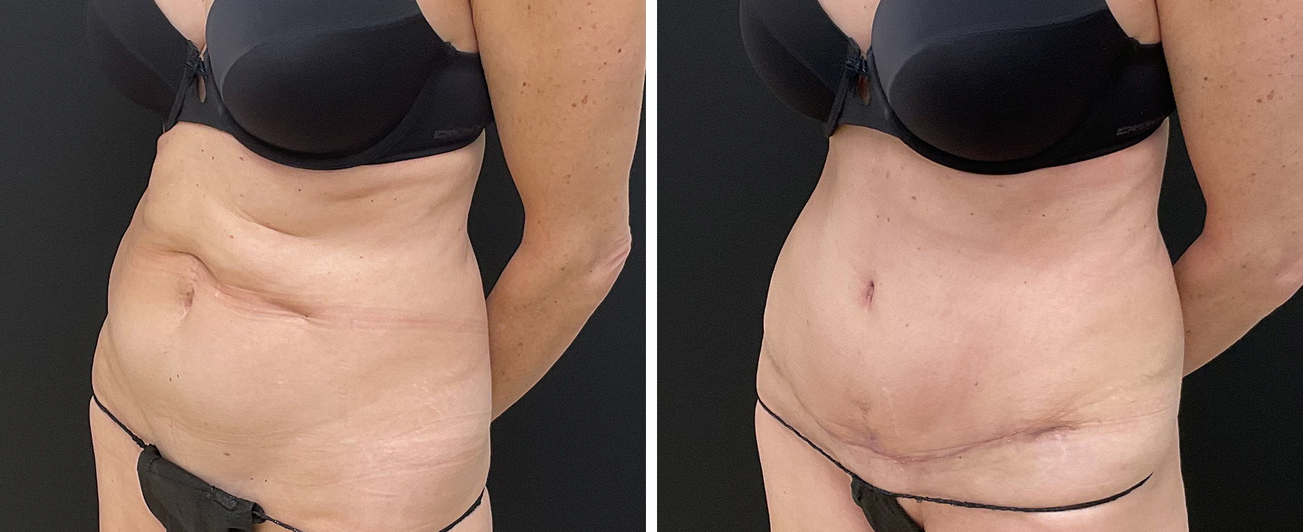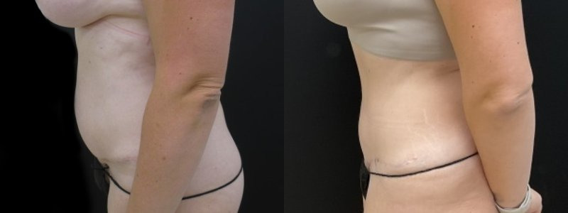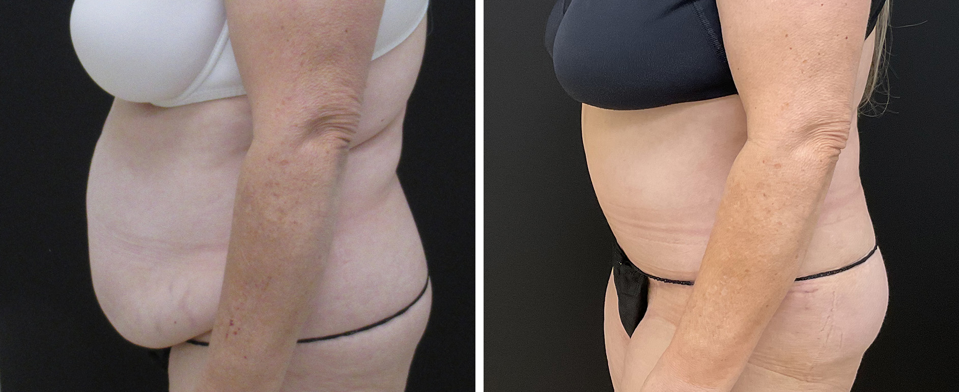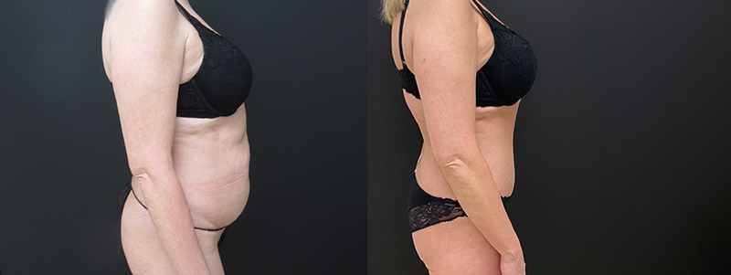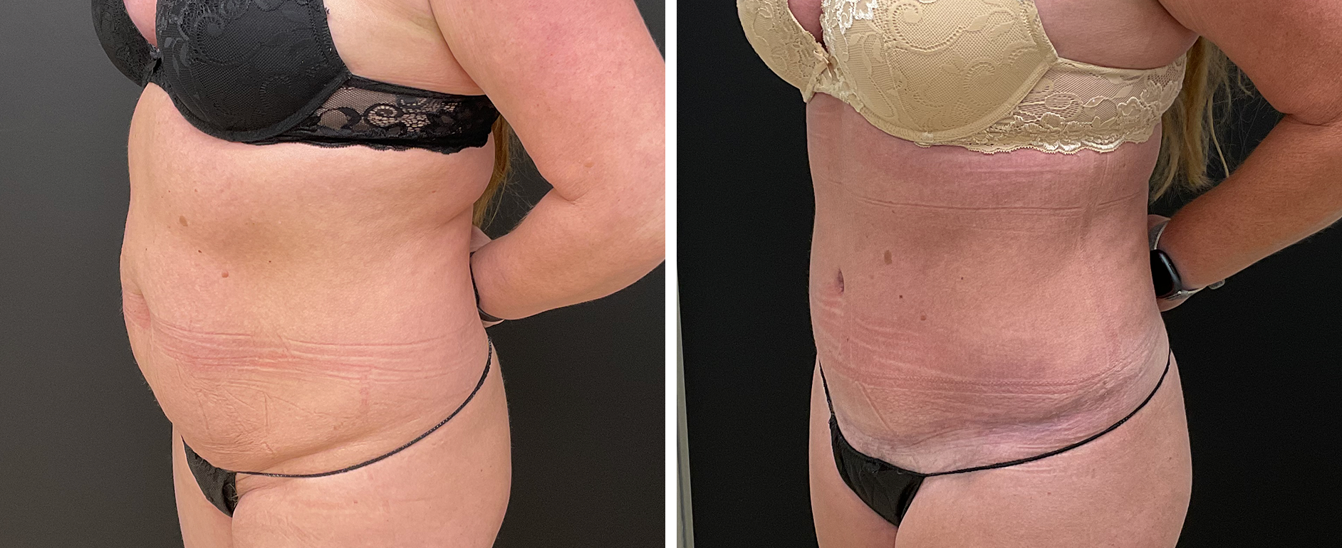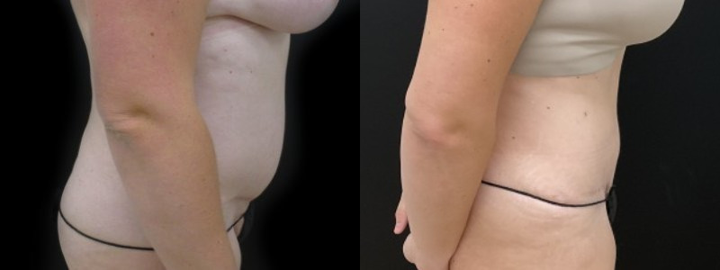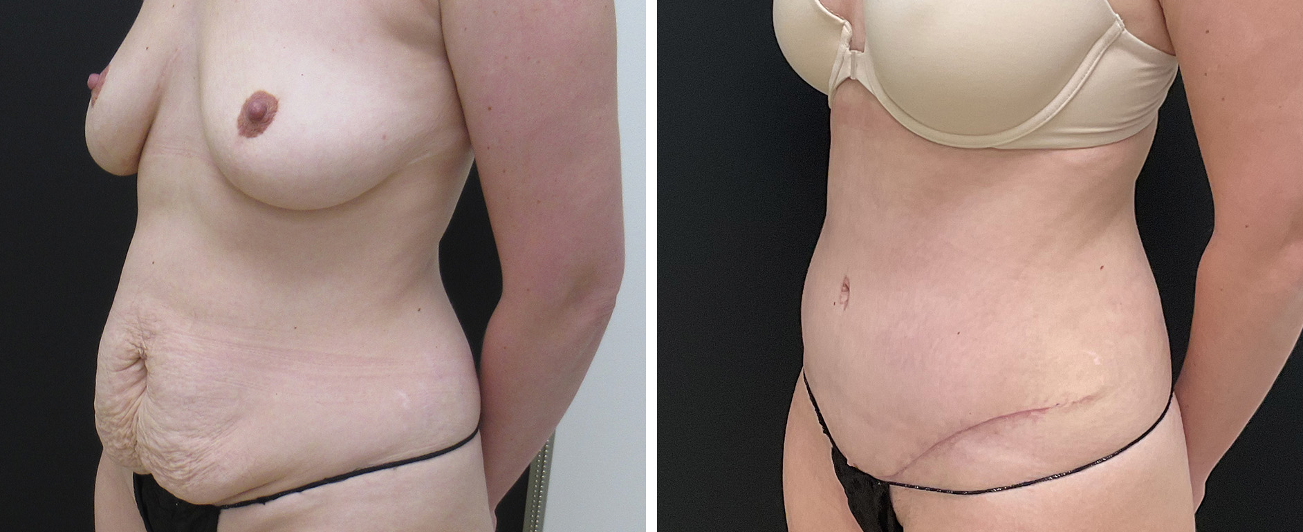 Our patient came to see Dr Roller unhappy with her stomach. Dr Roller performed an abdominoplasty (tummy-tuck) with muscle-tightening and liposuction to flanks and abdomen.