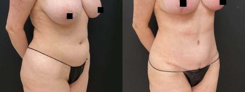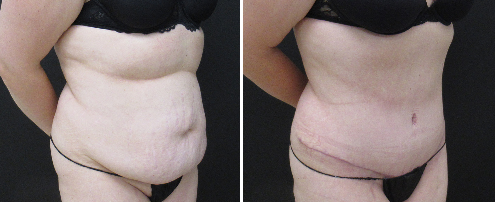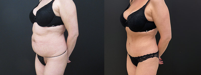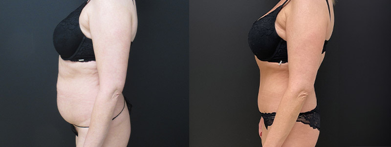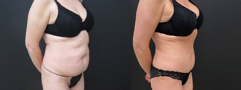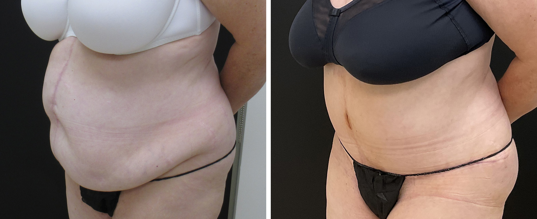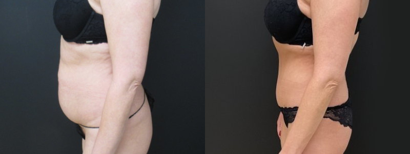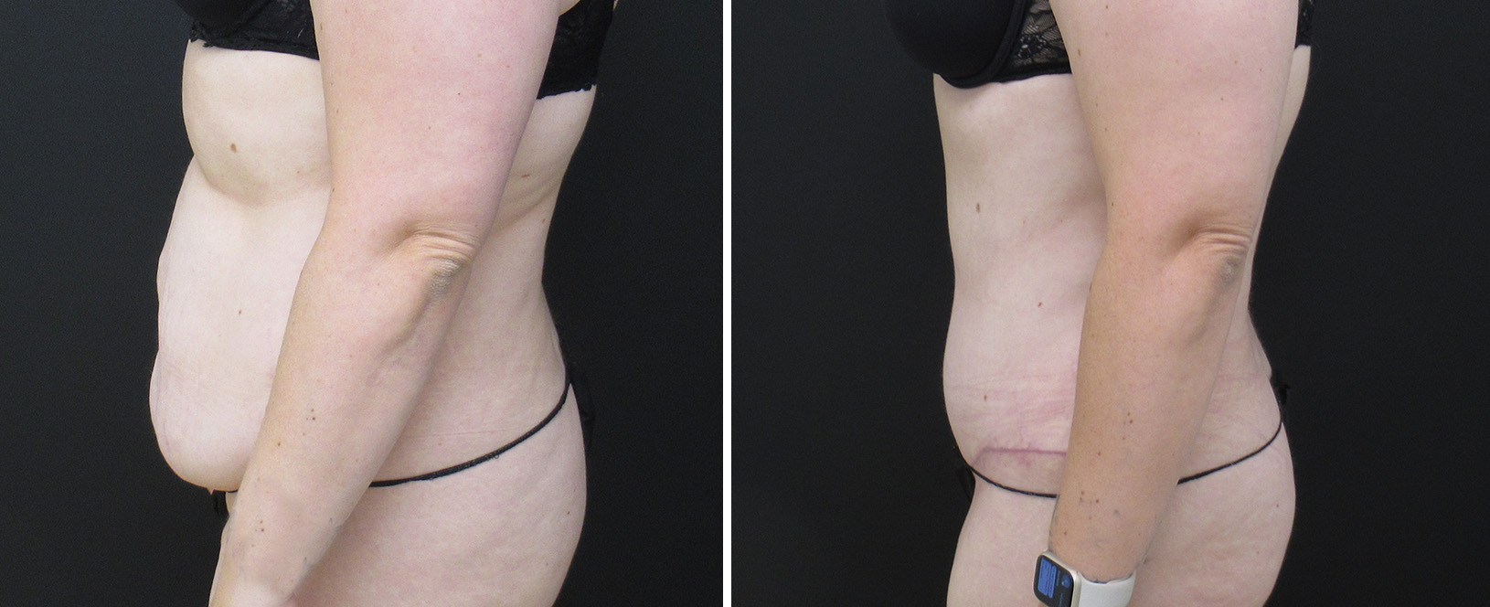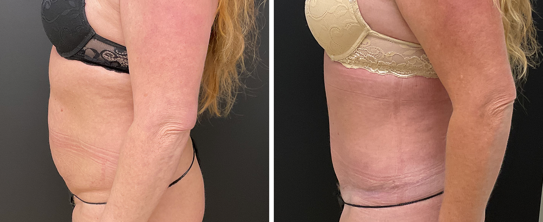 Our patient came to see Dr Roller unhappy with her stomach. Dr Roller performed an abdominoplasty (tummy-tuck) with muscle-tightening and liposuction to flanks and abdomen.