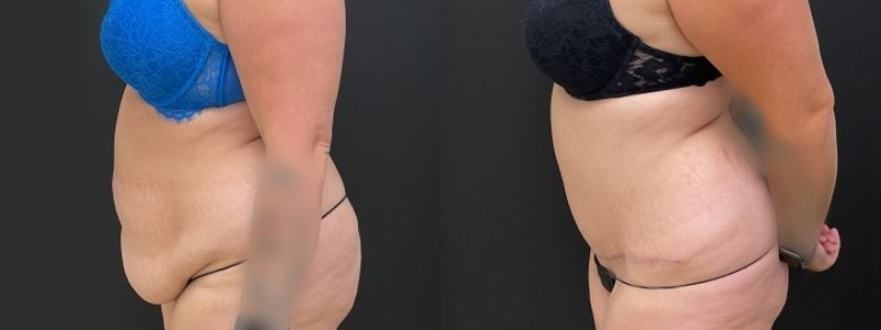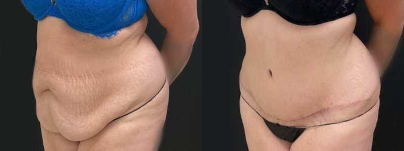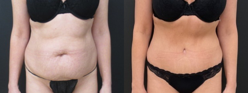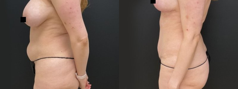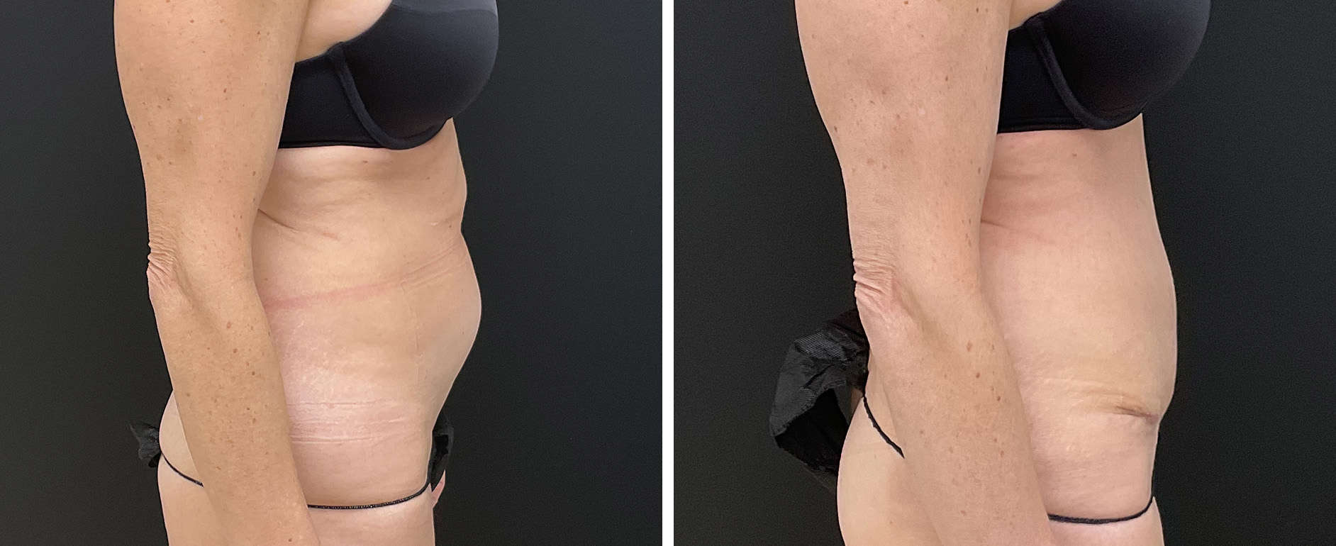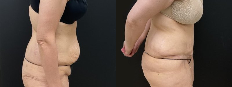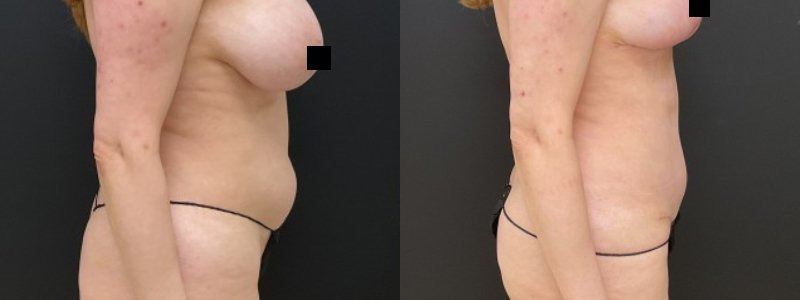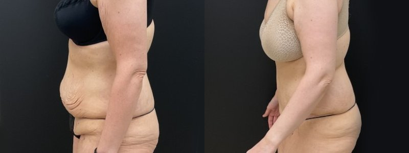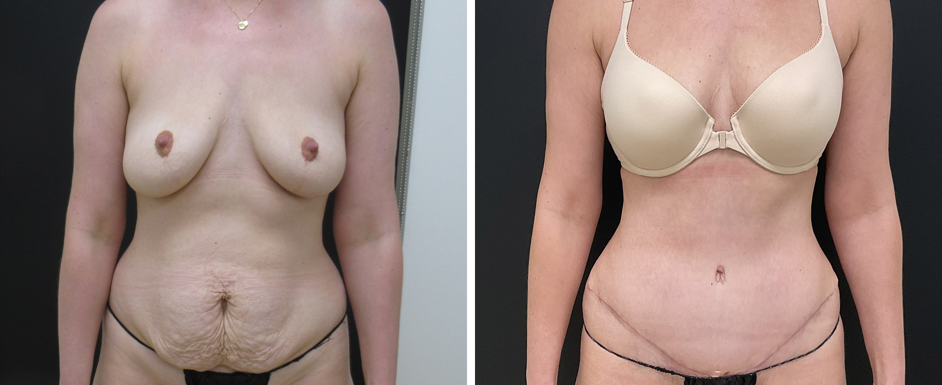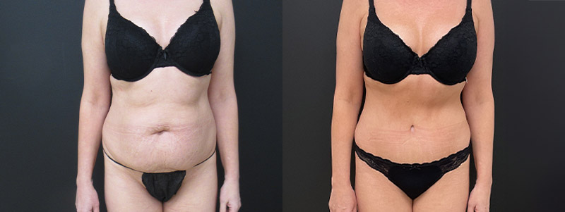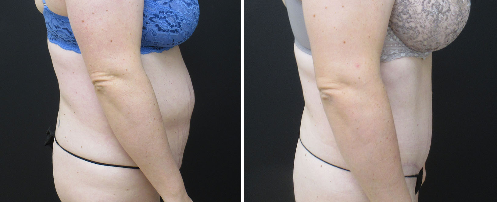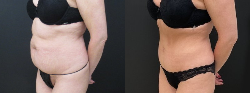 Our patient came to see Dr Roller unhappy with her stomach. Dr Roller performed an abdominoplasty (tummy-tuck) with muscle-tightening and liposuction to flanks and abdomen.