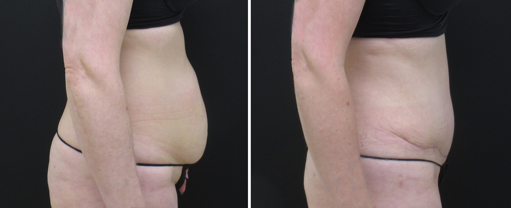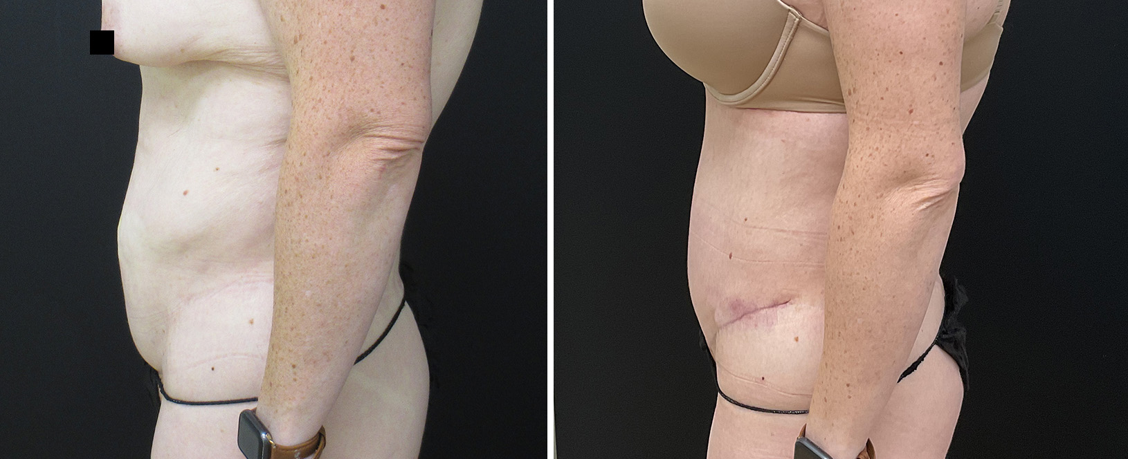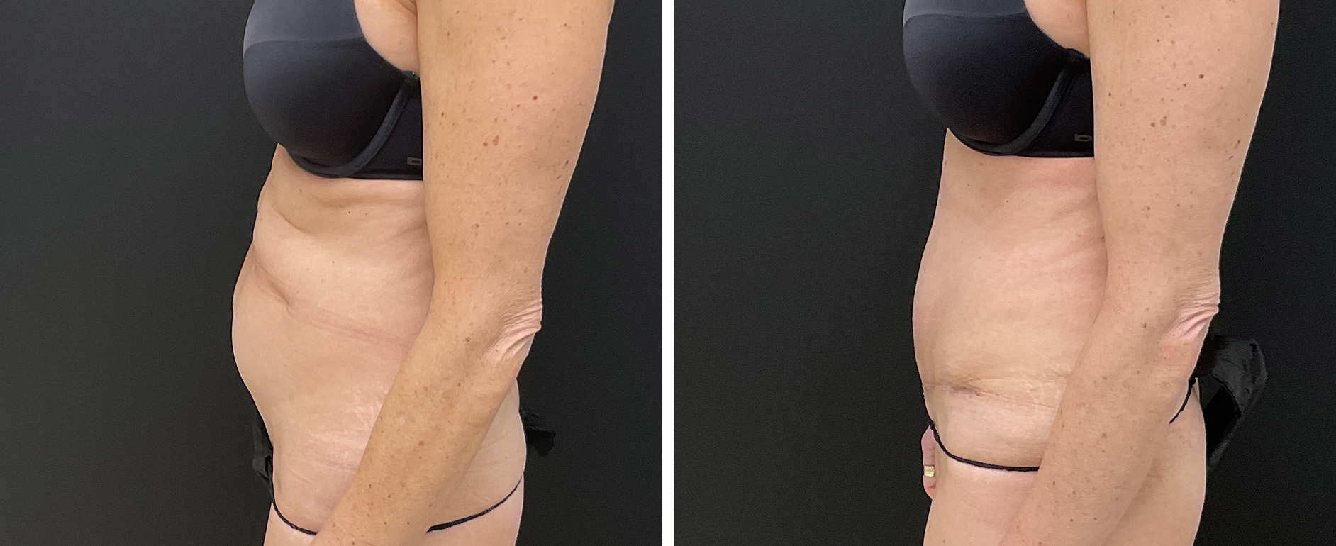 58-year-old, 5’5″, 140 lbs. Abdominoplasty with liposuction to flanks. Photos taken just under 3 months post-op.