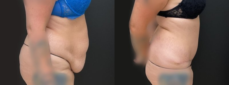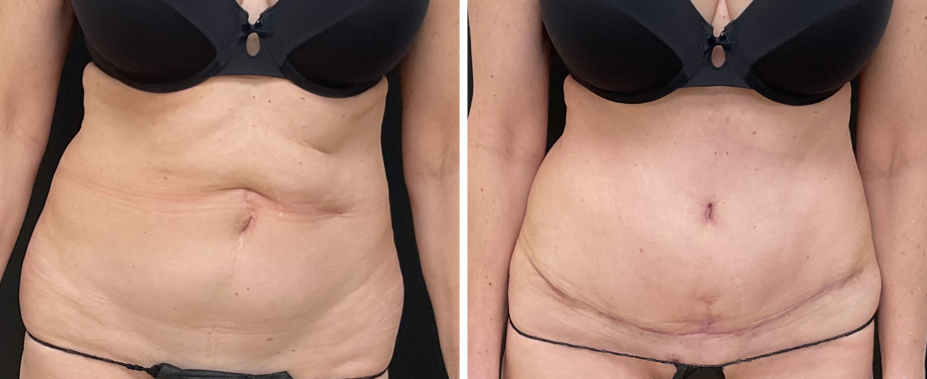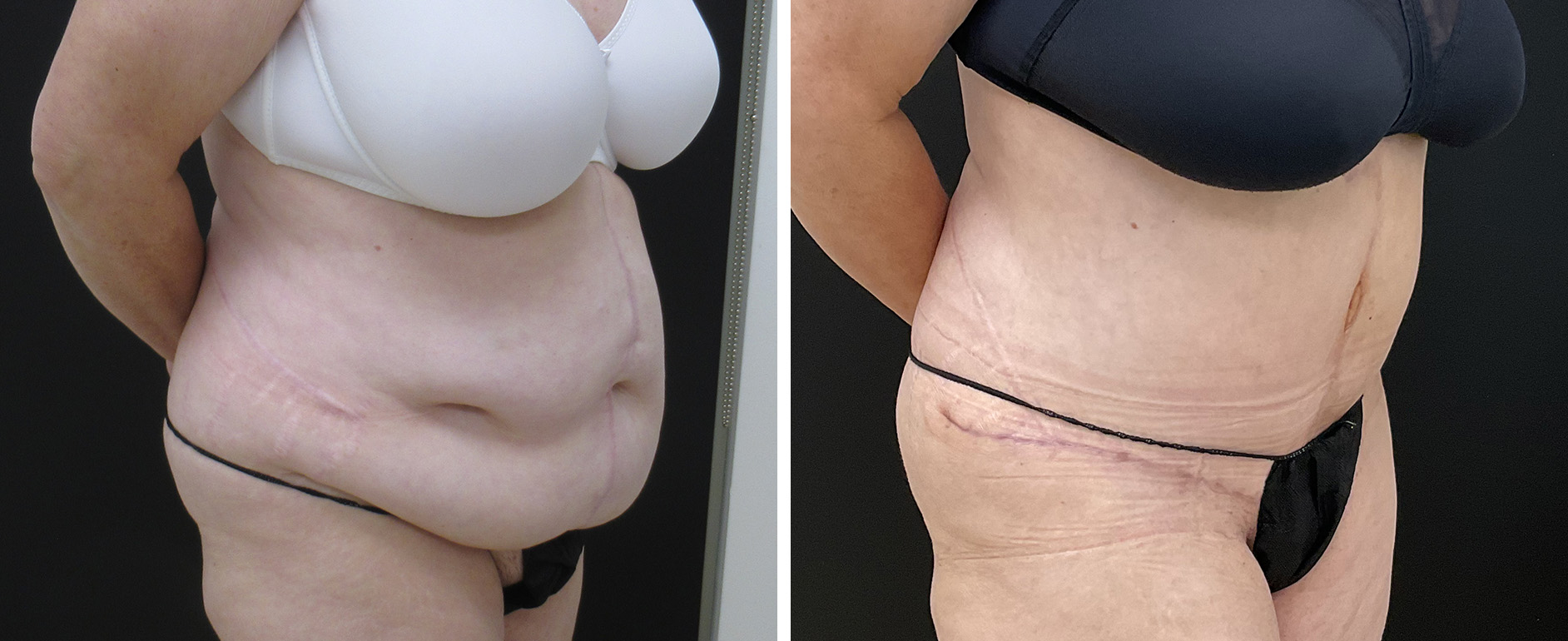 This lady in her 30’s had previously undergone a panniculectomy procedure and was complaining of a high-riding visible scar as well as residual excess skin and fat. She also felt her shape was ‘boxy’ and was requesting better hip-waist definition. She underwent a revision abdominoplasty procedure with liposuction to anterior abdomen, waist and flanks.
