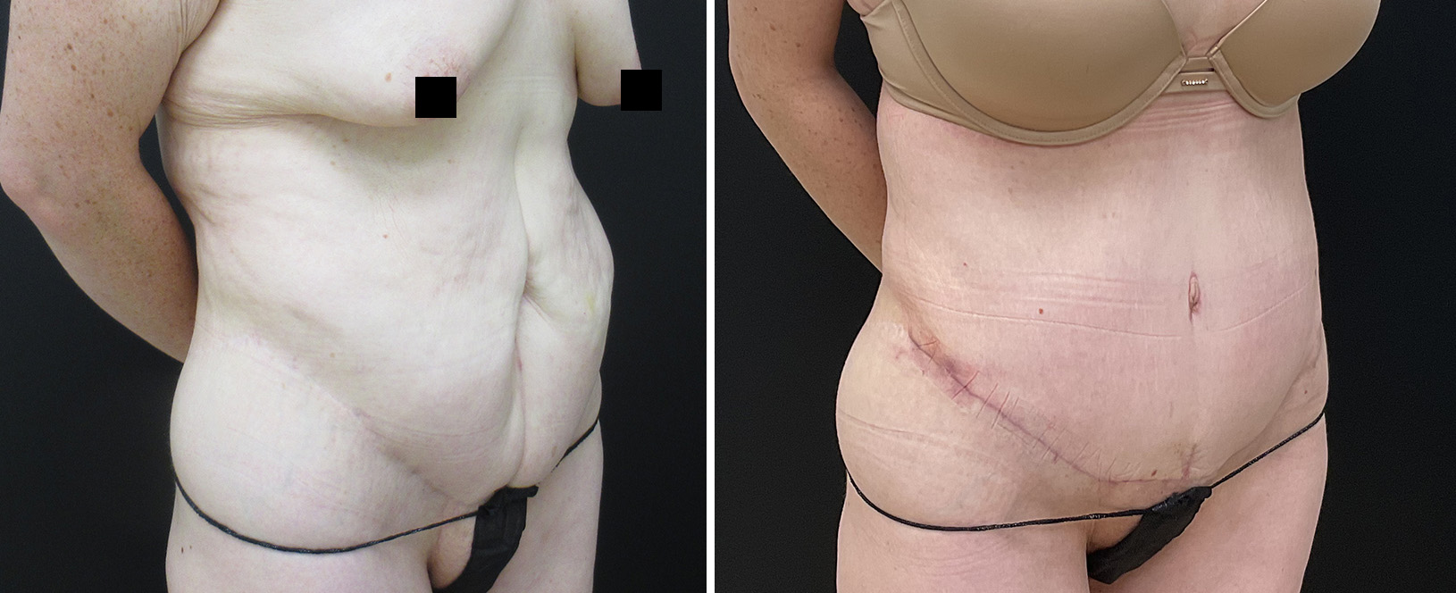 This 50-year-old lady lost approximately 100 lbs. and was seeking improvement in her anterior trunk region primarily. She underwent a tummy tuck with liposuction and muscle tightening. Post-op photos are taken 6 months later