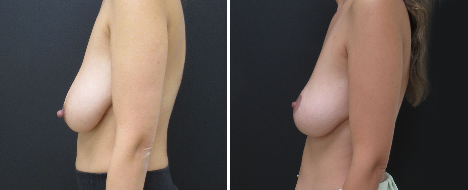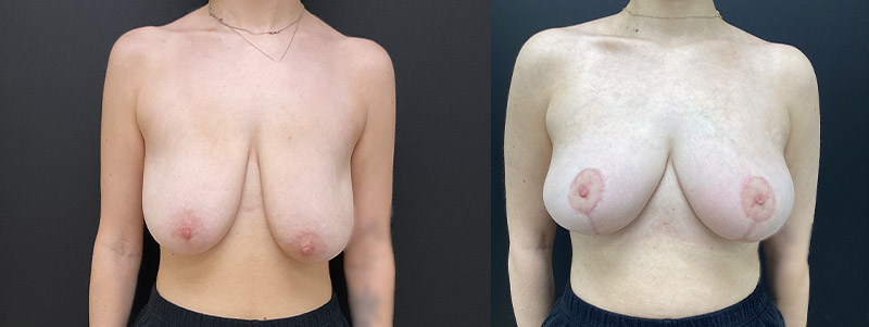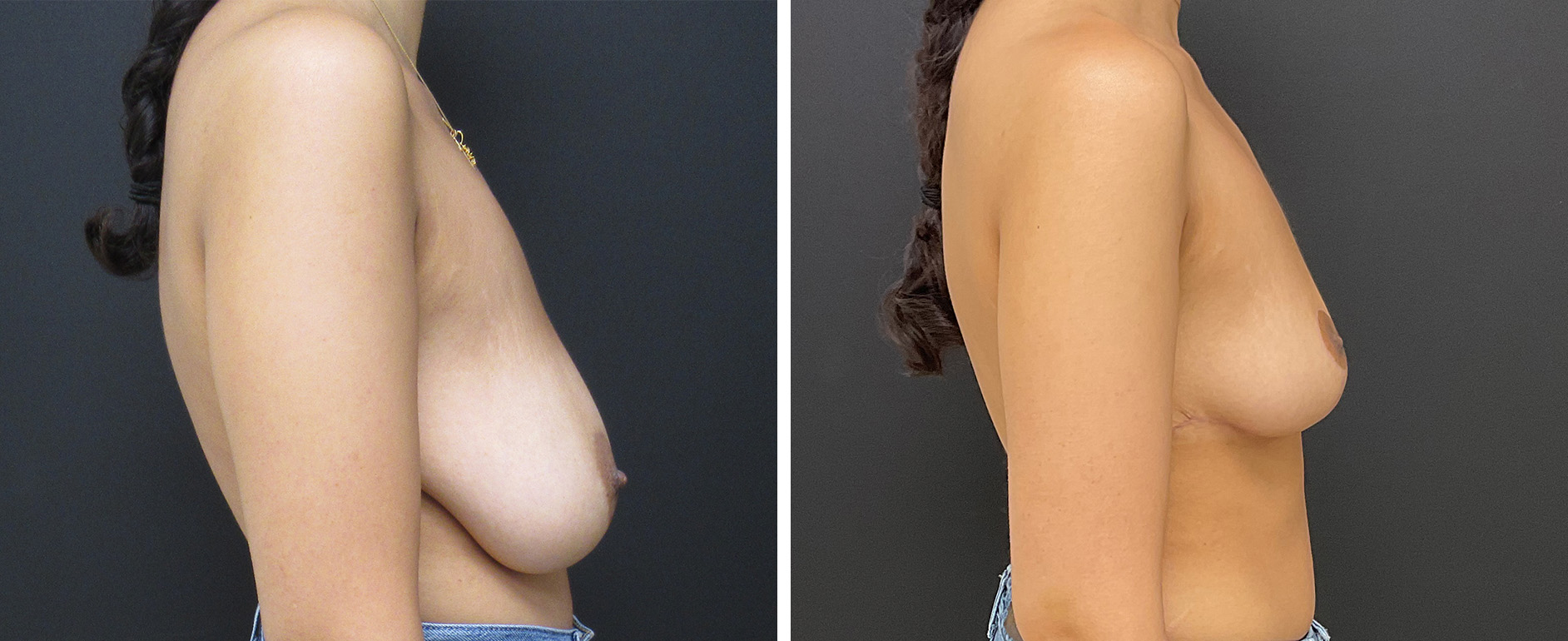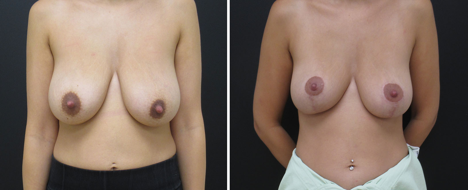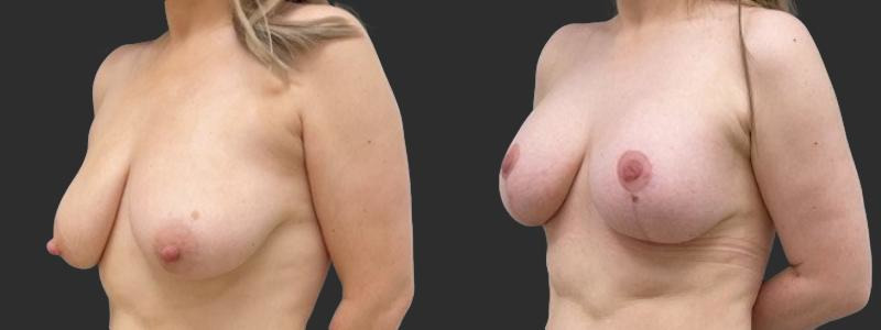 This lady under bilateral breast augmentation with balancing reduction and lift, using a matching set of 295 cc tear drop implants, and areola reduction.