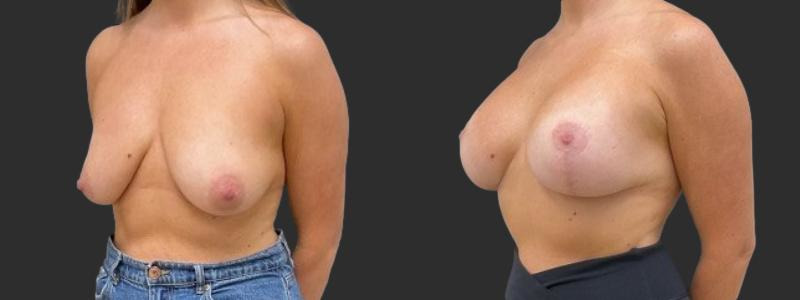 Removal and replacement of breast implants with Galaflex mesh reconstruction (right: 350cc, left: 300cc). Photos at 3 months post-op.