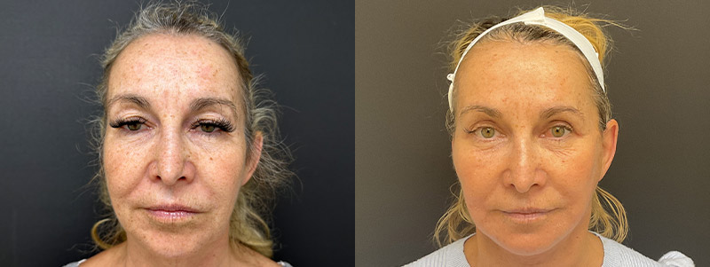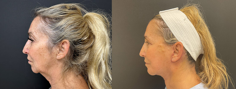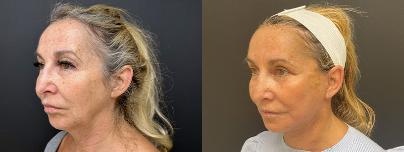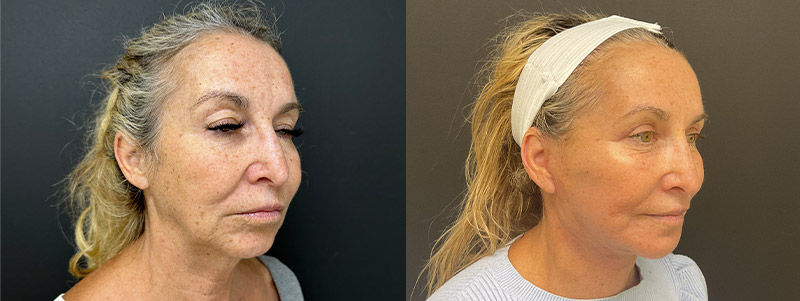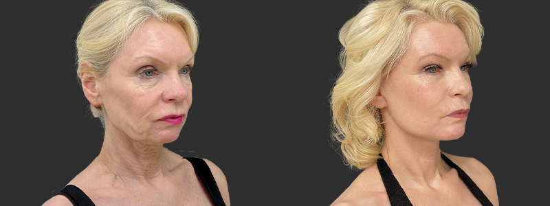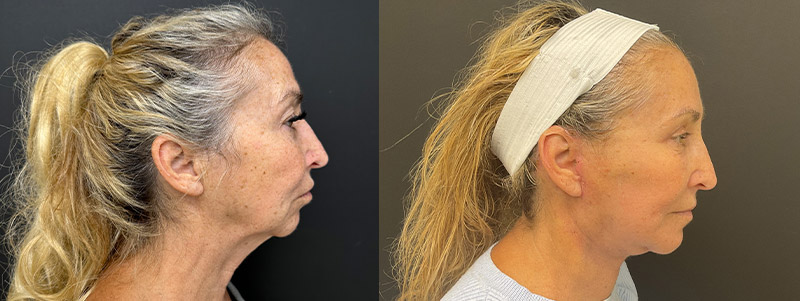 This 62 yr old lady had concerns regarding her heavy upper eyelids, heaviness in the cheek, jawline and neck. She underwent an upper blepharoplasty, deep plane face and necklift and chin augmentation. Her post-op photos are taken 1 month after surgery